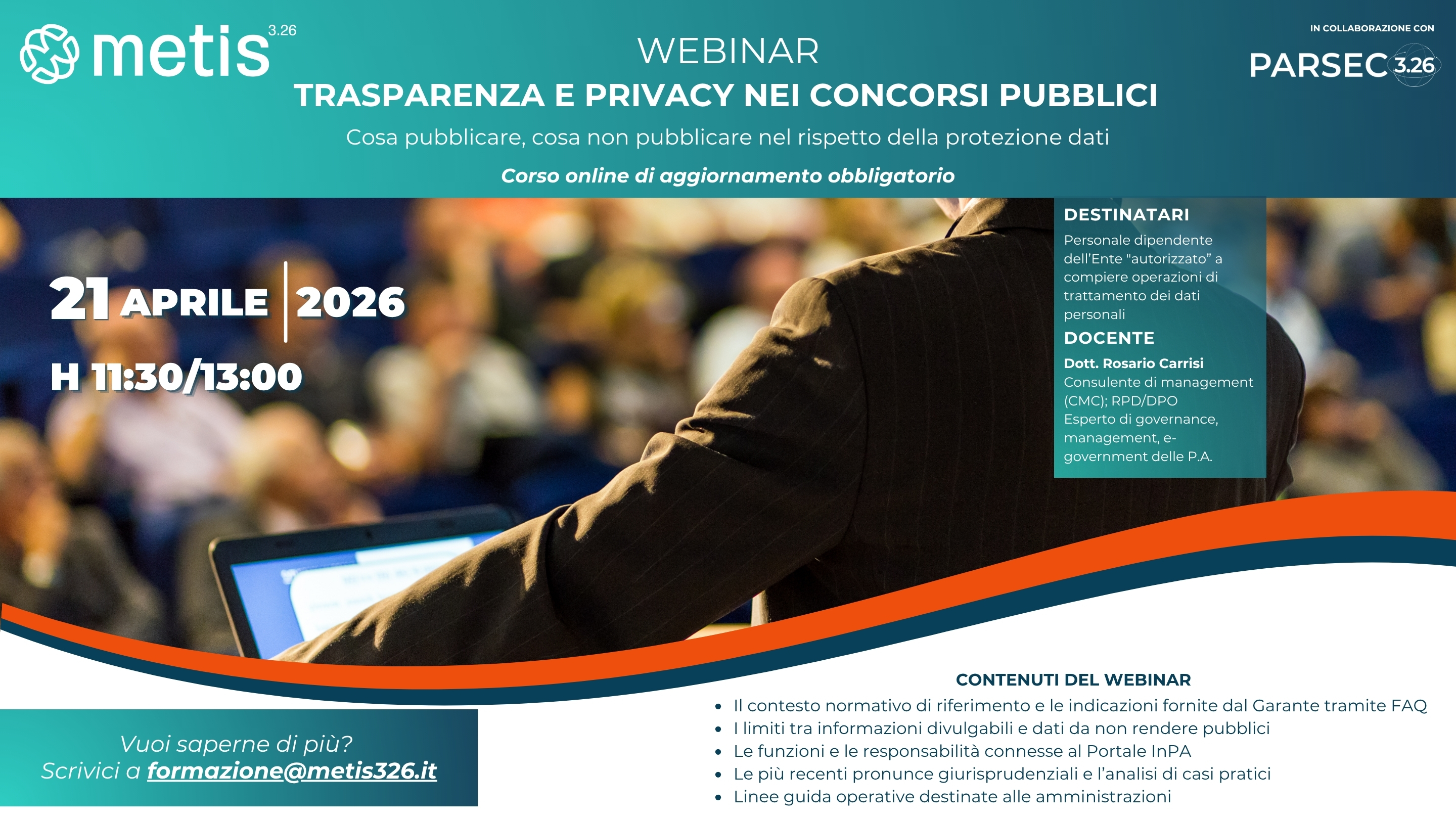 La formazione è nel DNA di Metis 3.26 e fin dalla sua nascita rappresenta una fonte primaria di qualità di prodotto e di servizio. Da sempre in Metis 3.26 si avvicendano eventi di aggiornamento interno e servizi di consulenza per i clienti, mirati alla comprensione, corretta interpretazione e recepimento delle leggi e regole tecniche della PA Digitale. Oltre a tenere sessioni formative e di aggiornamento presso i clienti, negli ultimi anni Parsec ha deciso di aprire al pubblico le attività di aggiornamento interno di ognuno dei suoi settori con la formula del corso di formazione e dei workshop.
